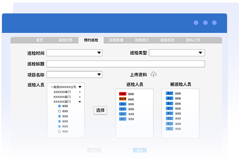預約巡檢界面主要用來預約巡檢會議,在該頁面填寫巡檢時間、巡檢類型、巡檢標題、項目名稱以及選擇巡檢人員和被巡檢人員,并上傳本次巡檢的流程資料。